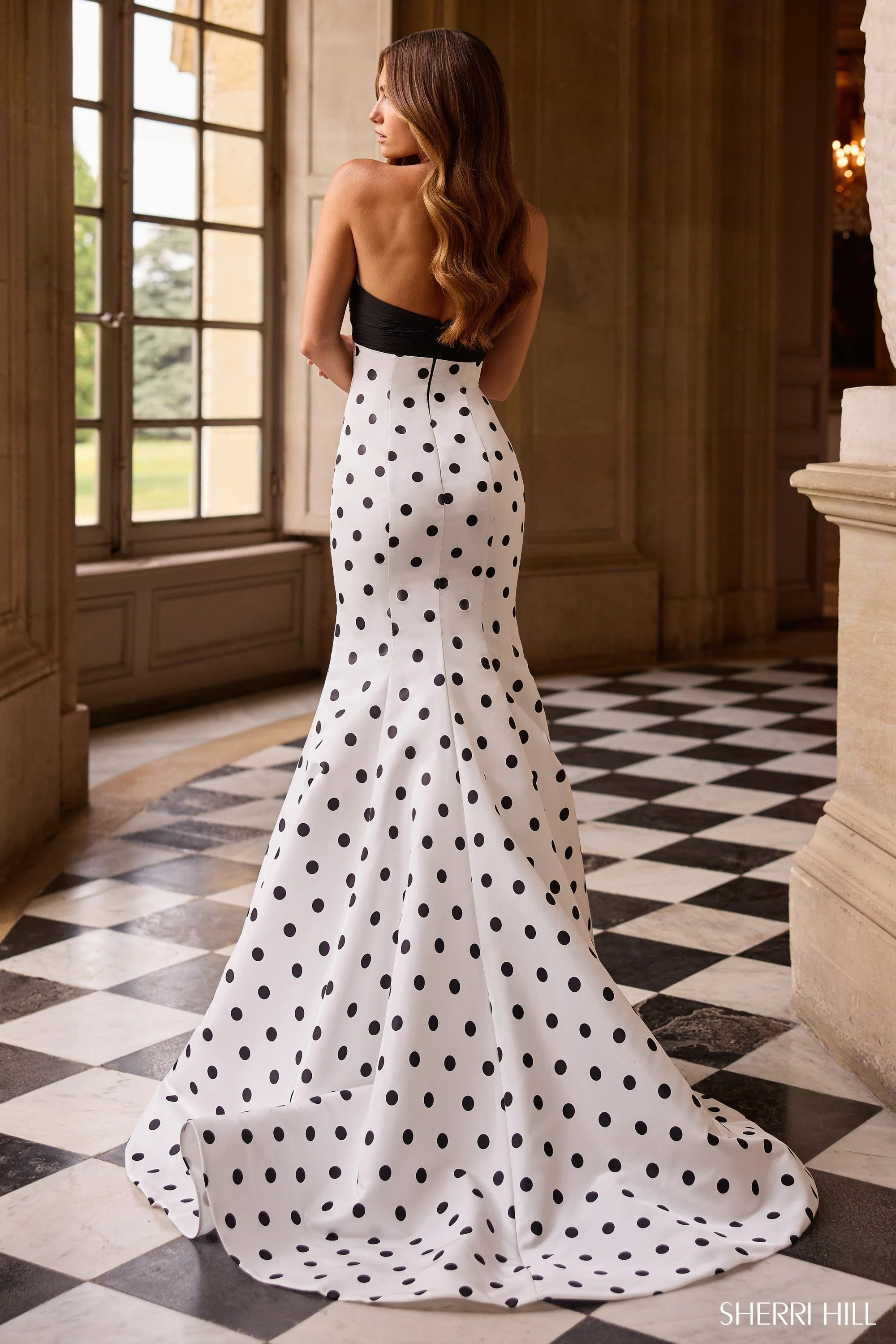 Strapless fitted taffeta mermaid polkadot gown with key hole bodice.